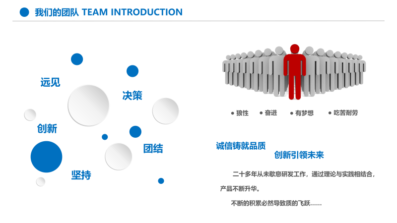 企業(yè)精神:務(wù)實(shí)、高效、嚴(yán)謹(jǐn)。市場(chǎng)意識(shí):思路決定出路;競(jìng)爭(zhēng)貴在品質(zhì)。